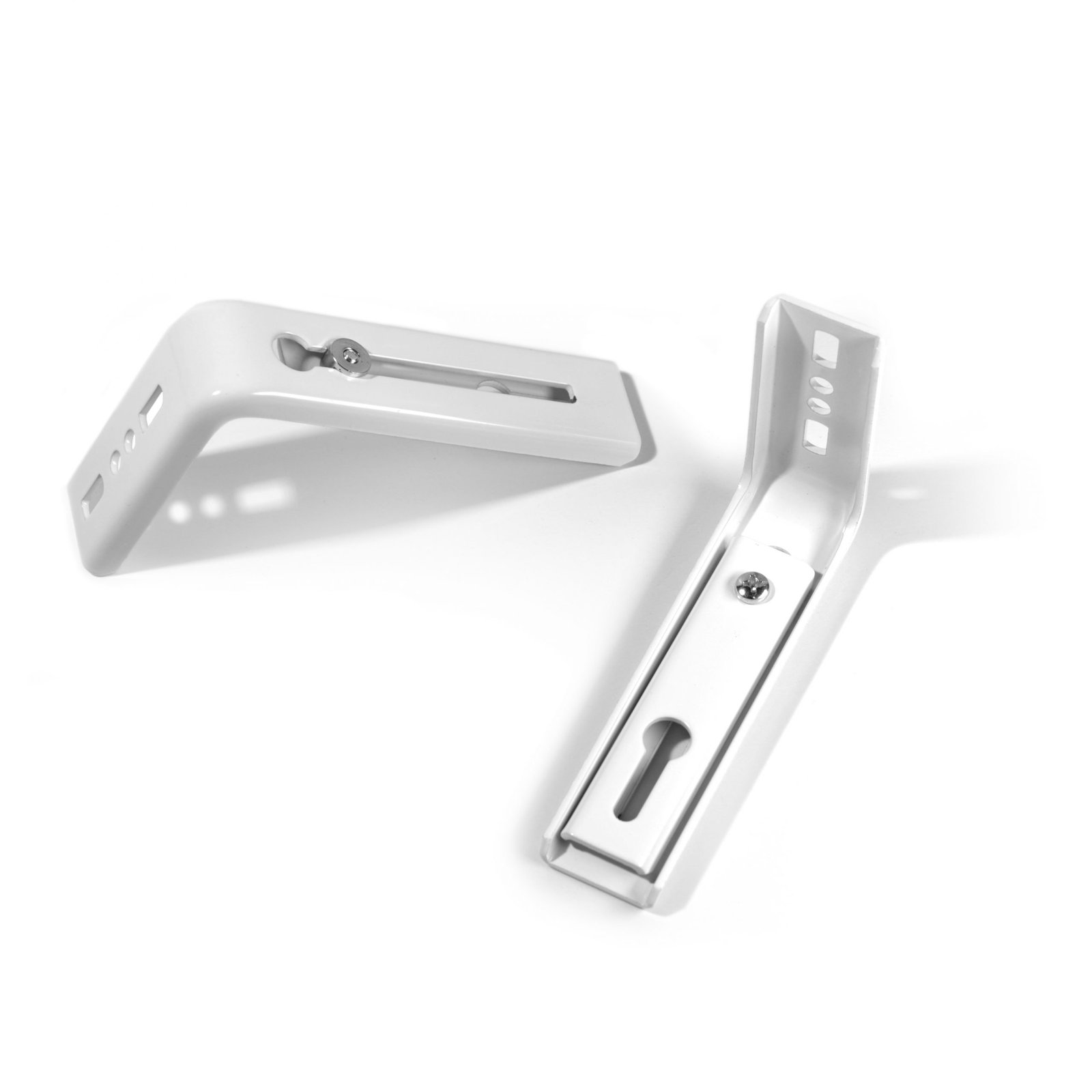 Permite fijar la cortina separada de la pared de 8,5 a 14,5 cm. De este modo, la cortina puede salvar muchos tipos de manillas y pomos que sobresalen de puertas y ventanas. Una vez fijadas la escuadra, la instalación de la cortina se hace como si fuese a techo. Pack de 2 unidades.