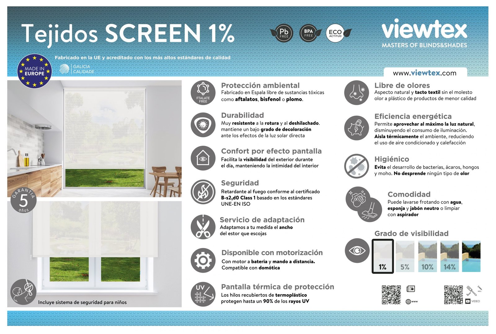 Estor enrollable estándar de polyscreen® con grado de apertura del 1% fabricado en España por Viewtex®. Cómodo, preciso y de fácil manejo e instalación, se presenta con un diseño funcional de alta calidad que combina en todo tipo de ambientes, sean clásicos o minimalistas. El color del mecanismo es bitono –plata mate y beige–. La transparencia del tejido permite una alta visibilidad hacia el exterior durante el día, filtrando la luz solar y preservando la intimidad interior. Las propiedades del tejido, convierten a este estor en una solución perfecta para protegernos del sol. Repele el polvo, polen, bacterias y hongos por lo que se recomienda en colegios y entornos de personas con alergias y/o asma. Resistente a ambientes húmedos y salinos, no deshilacha y tiene un bajo grado de decoloración. Libre de plomo y de metales pesados. Libre de ftalatos y bisfenol A. Tejido ignífugo según norma B-s2,d0 (no propaga el fuego en caso de incendio). Muy fácil de limpiar con una esponja, agua y jabón. Tubo de aluminio reforzado de 32mm. Contrapeso oculto aluminio. Garantía 3 años y fabricado en España ISO 9001 / 14001 / 45001 / 5000.