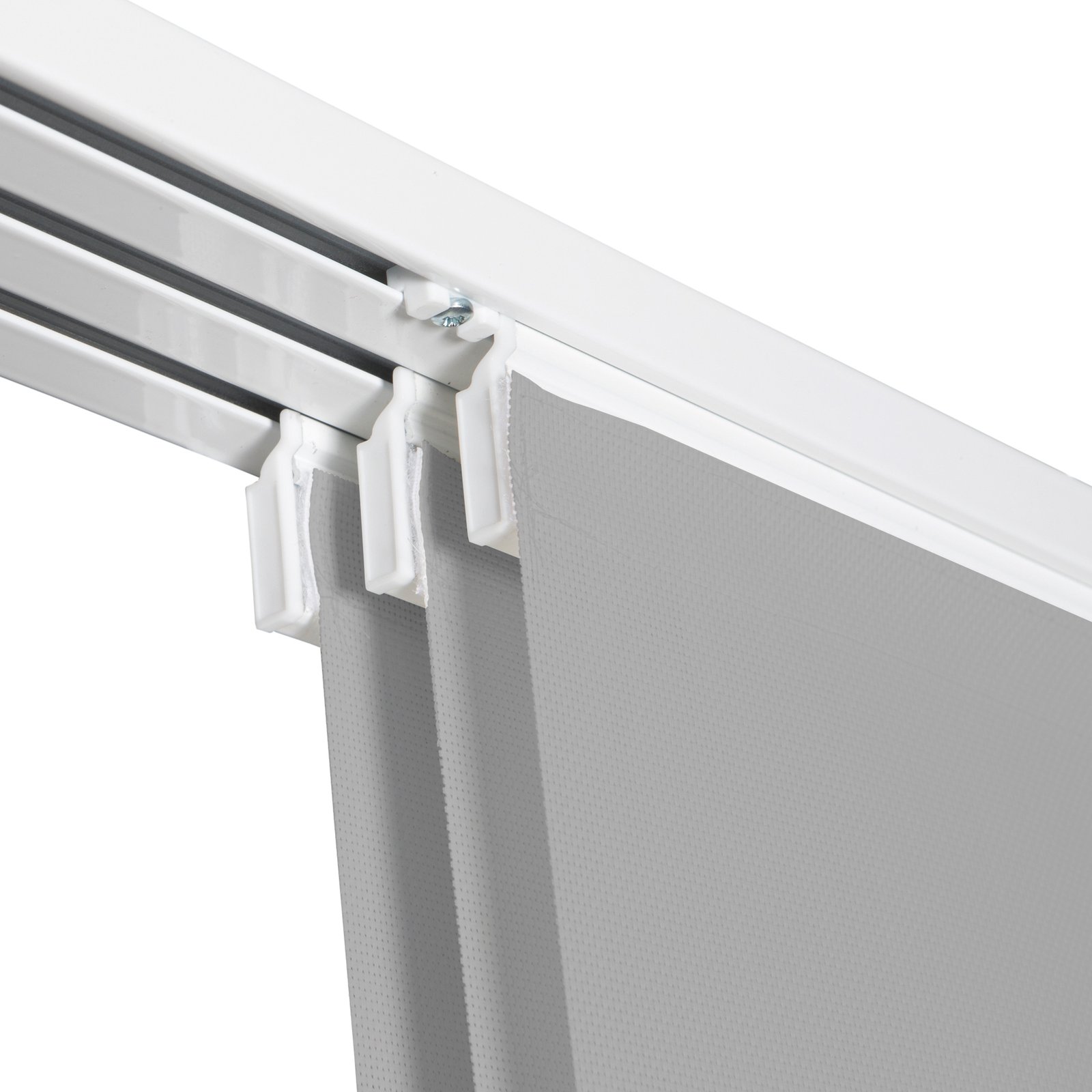 El kit incluye riel de aluminio de color blanco con 3 vías, 3 paneles de 50 cm de ancho y 270 cm de altura (altura ajustable), contrapesos vistos de aluminio y soportes para instalación a techo.