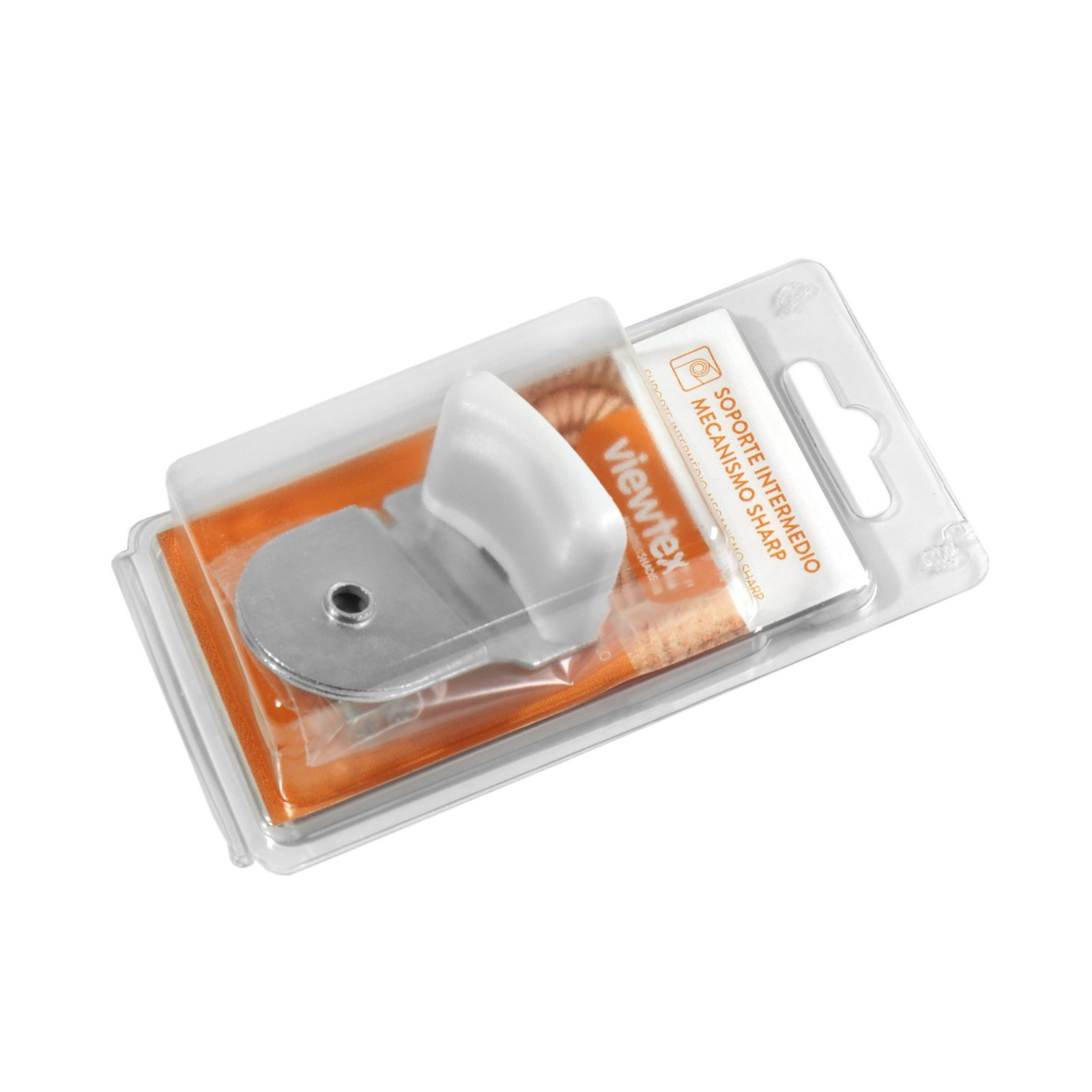 Soporte para unir dos cortinas enrollables con mecanismos Sharp cuando se quiere cubrir una gran superficie y no es posible con una única cortina. Tiene la ventaja de que minimiza la distancia entre las cortinas. Blíster con 1 pieza.
